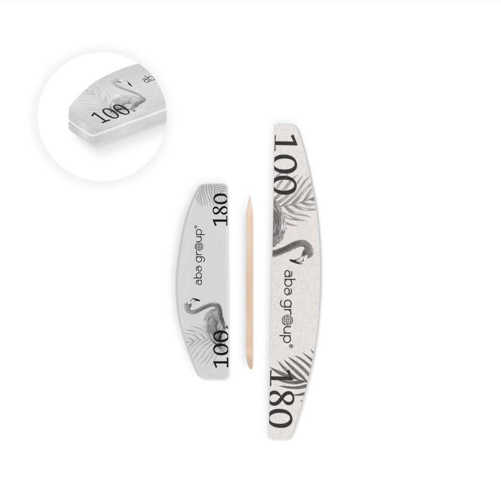 Az Aba Group szett egy higiénikus, külön csomagolt, praktikus készlet, amely tartalmaz mindent, amire egy alap manikűr előkészítéshez szükség lehet. A csomagban megtalálható egy 100/180-as félhold formájú körömreszelő, egy mini buffer (polírozó blokk), valamint egy narancsfapálcika, amelyek együtt ideális megoldást kínálnak mind szalonban, mind otthoni használatra.