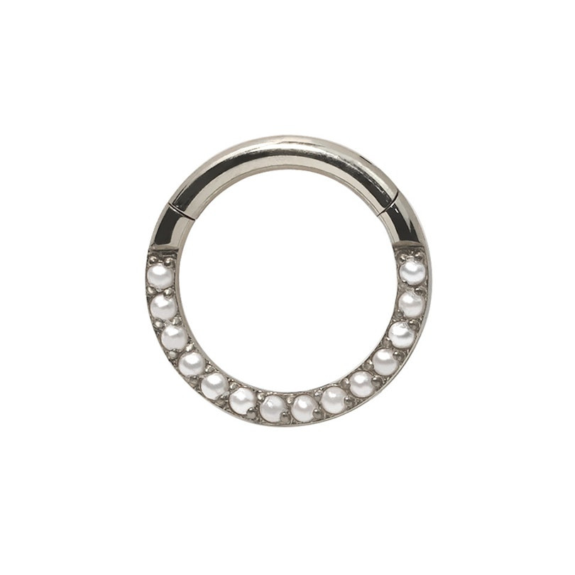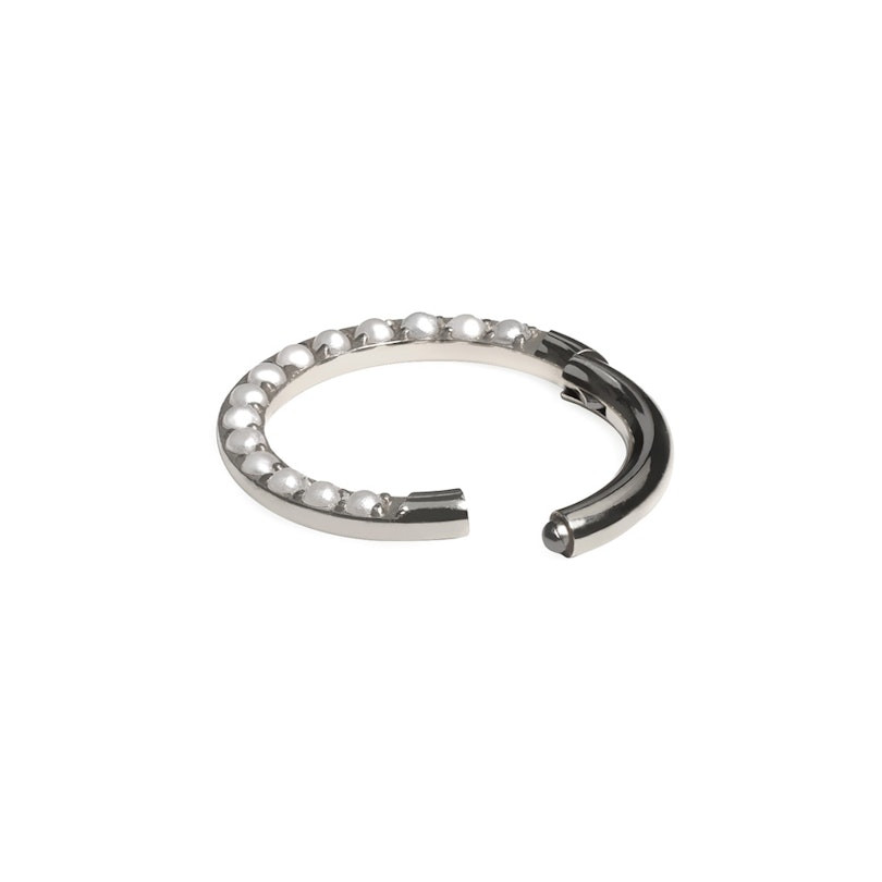 Ez a kapcsos titán karika előre néző, szintetikus gyöngyökkel van kirakva, ezért tökéletes septum vagy daith piercingekhez.Az implantátum minőségű, hipoallergén titánból készült ékszer biztonságos az érzékeny bőrre, hosszan tartó kényelmet és irritációmentes viseletet biztosít.A könnyen használható kapcsos zár azt jelenti, hogy egyszerű az ékszert behelyezni és rögzíteni a piercingbe.