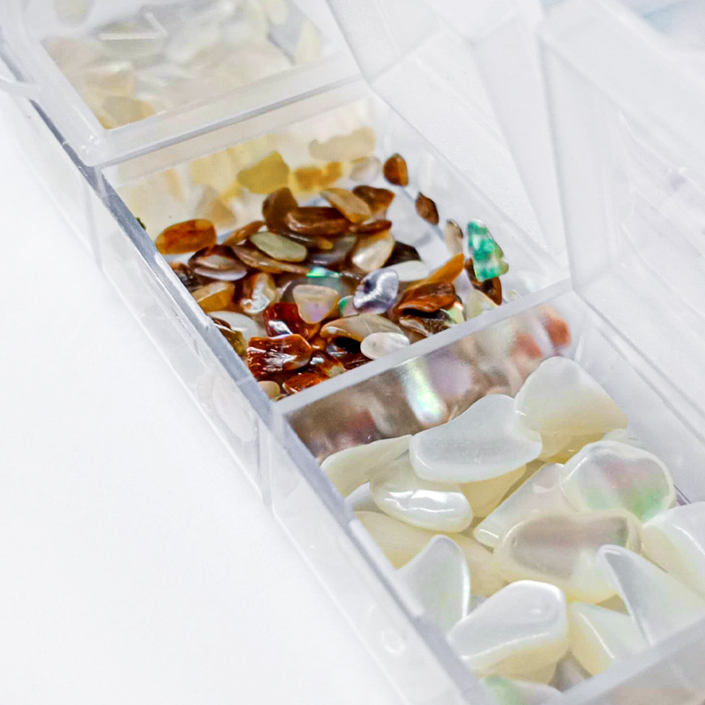 Törött kagylóhéj díszítő készlet praktikus rekeszes dobozban. Különleges, gyöngyházfényű hatást ad a körmöknek, tökéletes választás zselés, porcelán vagy lakkozott körmökhöz.