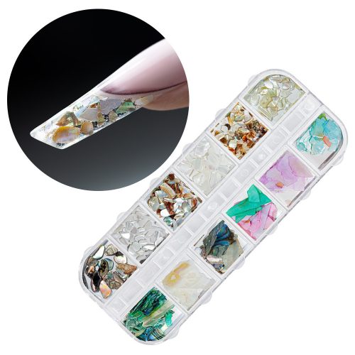 Törött kagylóhéj díszítő készlet praktikus rekeszes dobozban. Különleges, gyöngyházfényű hatást ad a körmöknek, tökéletes választás zselés, porcelán vagy lakkozott körmökhöz.