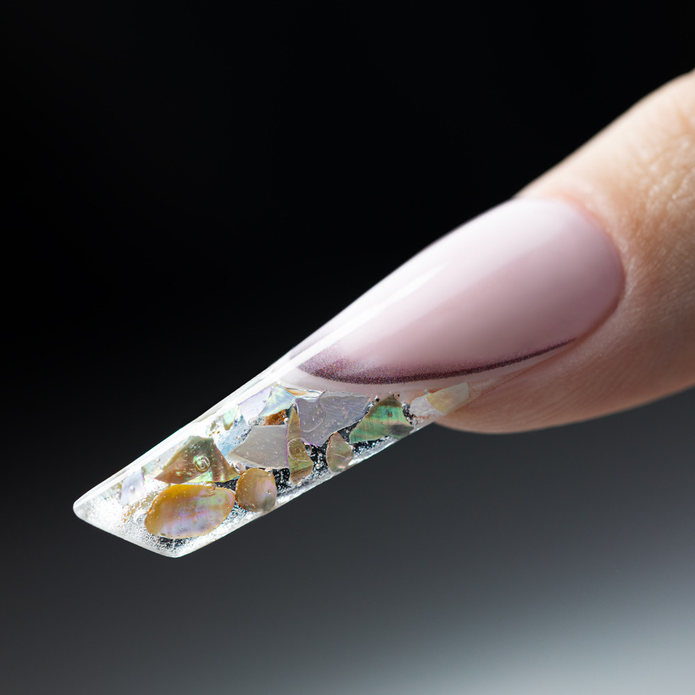 Ajánlott felhasználás:Vigyél fel egy vékony réteg építőzselét vagy ragasztó zselét a körömre, helyezd bele a kagylódarabokat, majd fixáld fényzselével vagy átlátszó fedőréteggel. A végeredmény tartós, mégis különleges megjelenésű lesz.